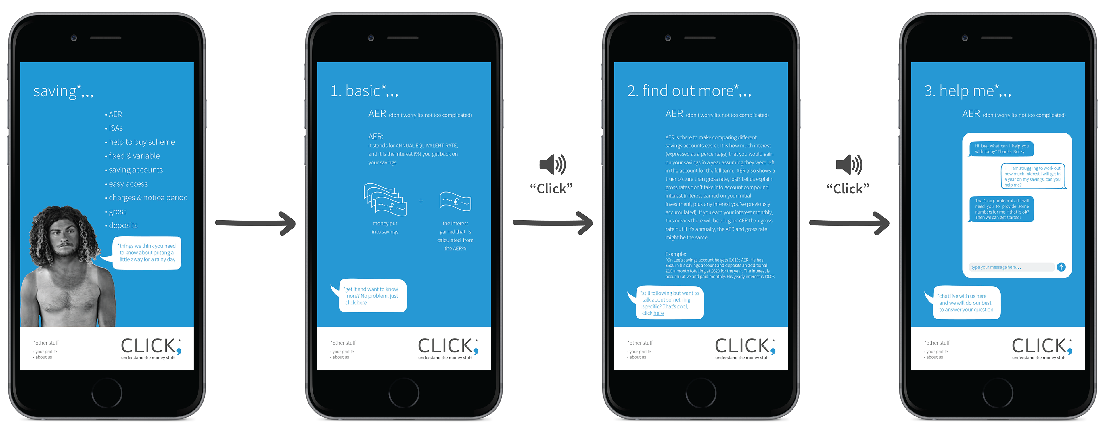 Click is a independent service that operates through an app providing people with information they need to actually understand and deal with their money. Managing your finances can be difficult which isn’t made easier by the long-winded and confusing information. It doesn’t matter whether you know your APR from your AER because you will get it with Click.